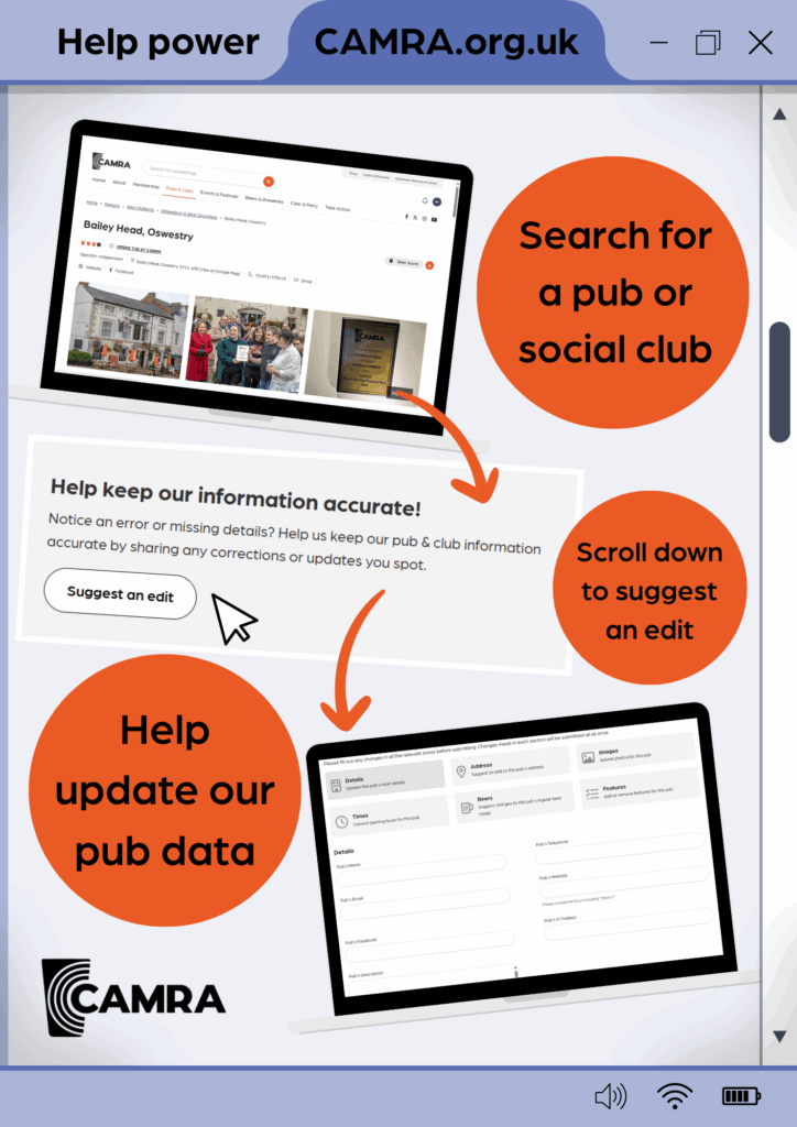 You can help power CAMRA’s campaigning by submitting updates about pubs. Simply go to a pub’s listing on the website and scroll down to the ‘suggest an edit’ section. This will alert the local branch that the pub’s information needs to be updated. It couldn’t be easier!